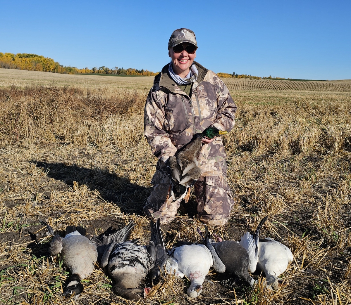 By afternoon, we moved to a pea field with round bales scattered throughout. It offered a classic prairie setup that delivered nonstop excitement. Pintails banked gracefully into the wind, mallards dropped like green-headed missiles, and snow geese arrived in massive waves. At one point, a flock of more than a thousand snows circled three times before committing, finishing right in front of us in a blur of wings and honks. The giggles and excited voices left little doubt that everyone was having a wonderful time.